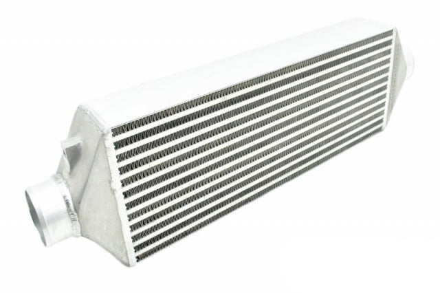 Brand new series intercooler with center inlet outlet configuration. Divergent nozzle design allows greater air flow to the top and bottom of the intercooler for increased efficiency. Perfect size intercooler for many turbocharged applications under 500hp.